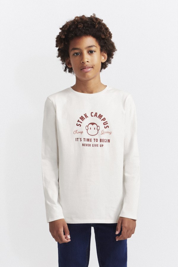 Camiseta de manga larga disponible en tallas de 2 a 16 años. Camiseta en punto de algodón color crudo con cuello redondo y bajo recto. Presenta estampado frontal con texto “STMK CAMPUS” en tonos rojizos y dibujo central de mono, con frases motivadoras en diferentes tipografías. Una prenda versátil y cómoda para el día a día con un toque divertido y urbano.