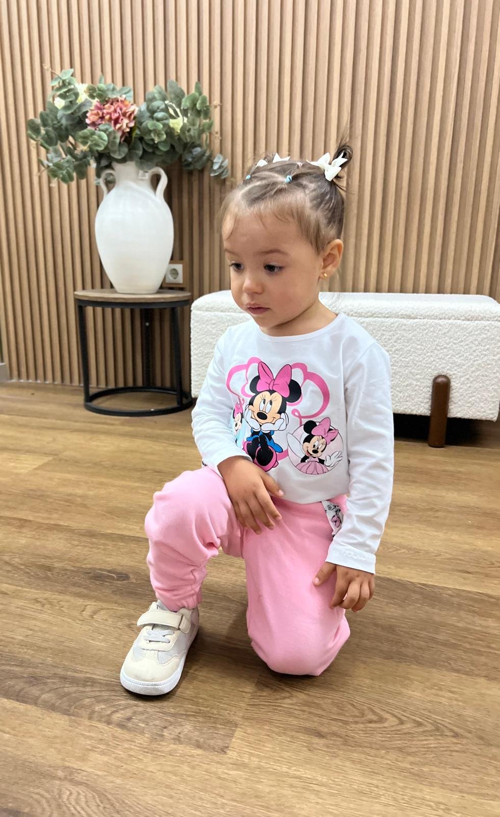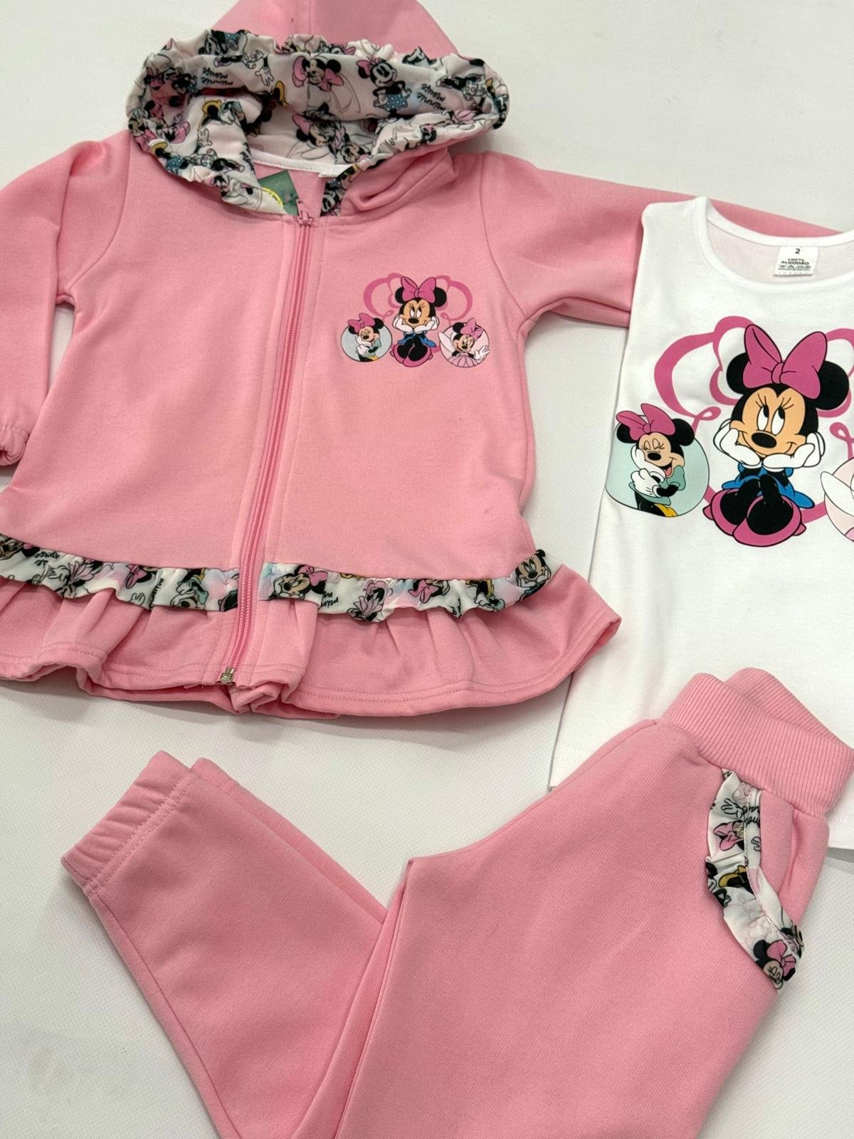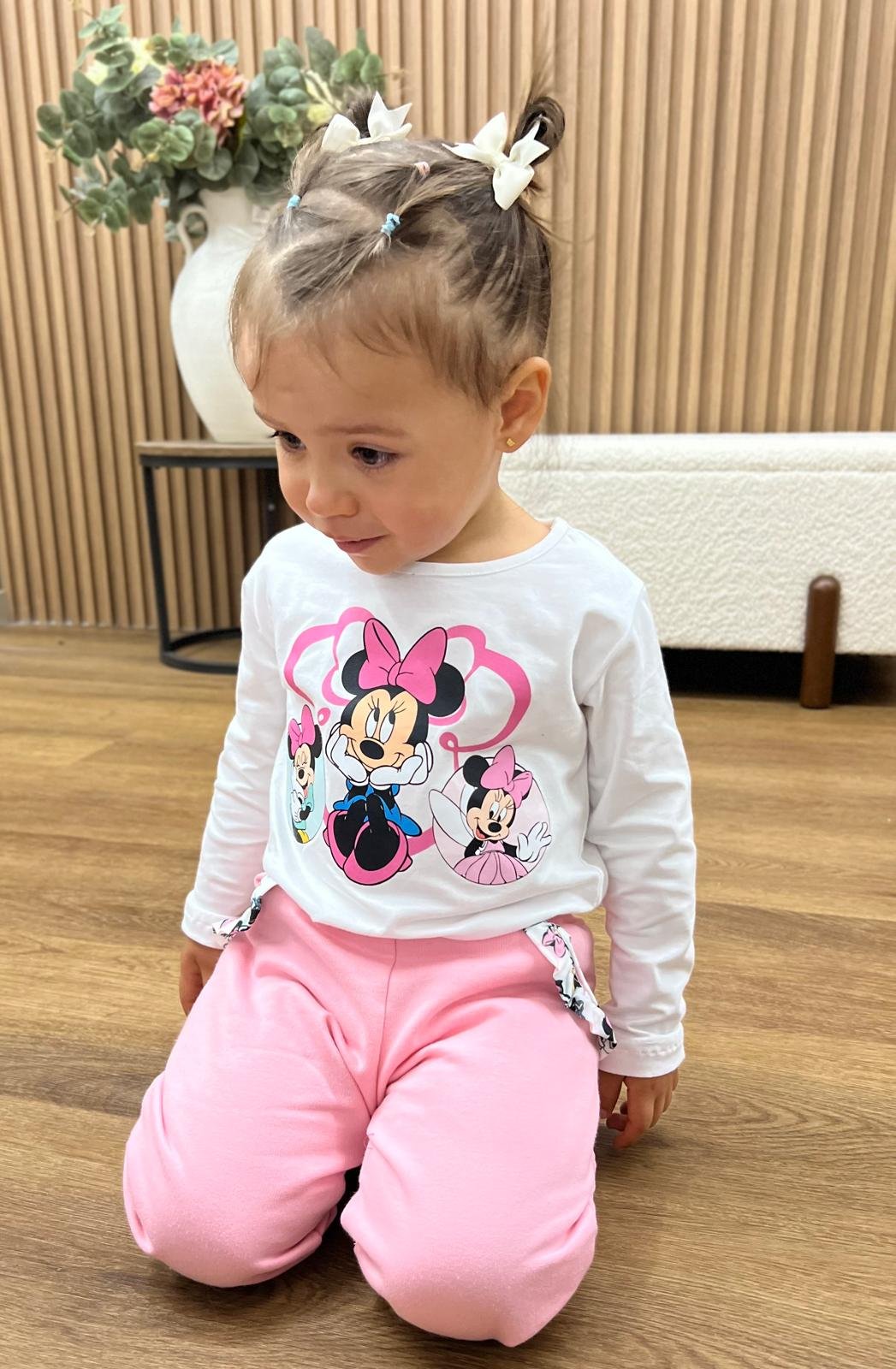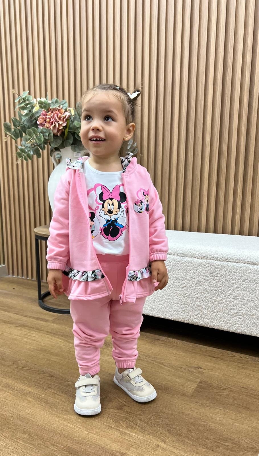 Chándal Minnie para bebé y niña pequeña. Color rosa y estampado de «Minnie». Detalle de «Minnie» en los volantes.