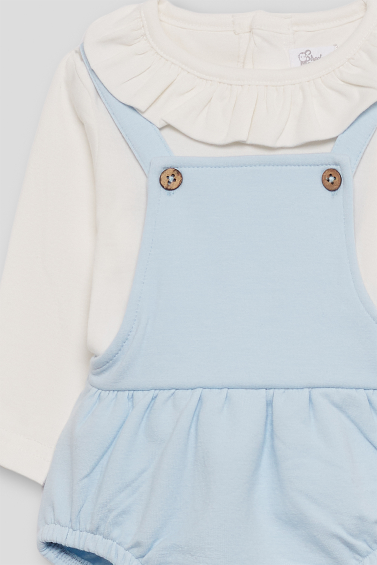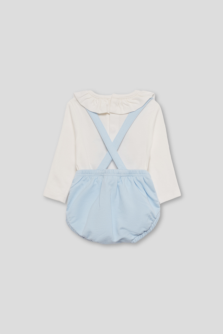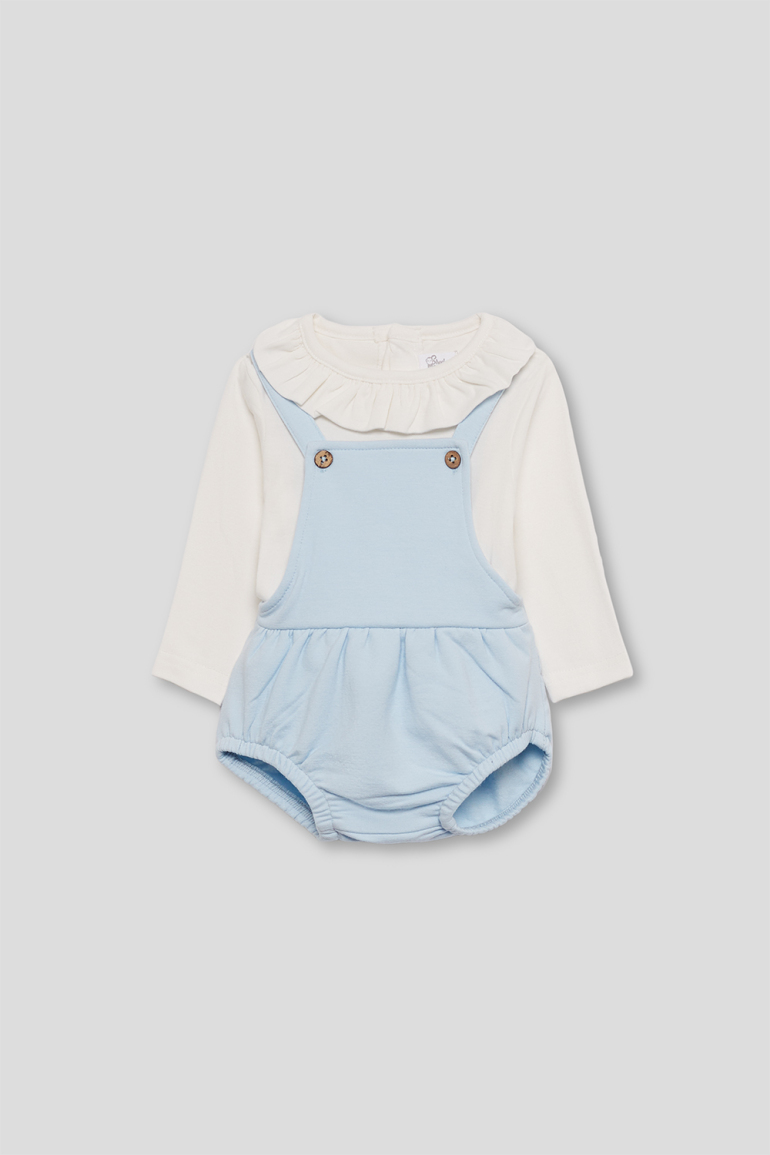 Conjunto de dos piezas, camiseta y ranita con tirantes para bebé niña de 1 a 24 meses. La camiseta en color crudo está confeccionada en punto suave con manga larga, cuello redondo adornado con volante y cierre trasero con automáticos para facilitar el cambio. La ranita azulina de felpa perchada lleva tirantes cruzados en la espalda con botones decorativos en el delantero y cintura elástica para mayor comodidad. El bajo con goma proporciona un ajuste perfecto sin apretar. Un conjunto encantador, cálido y cómodo, ideal para los días de invierno.