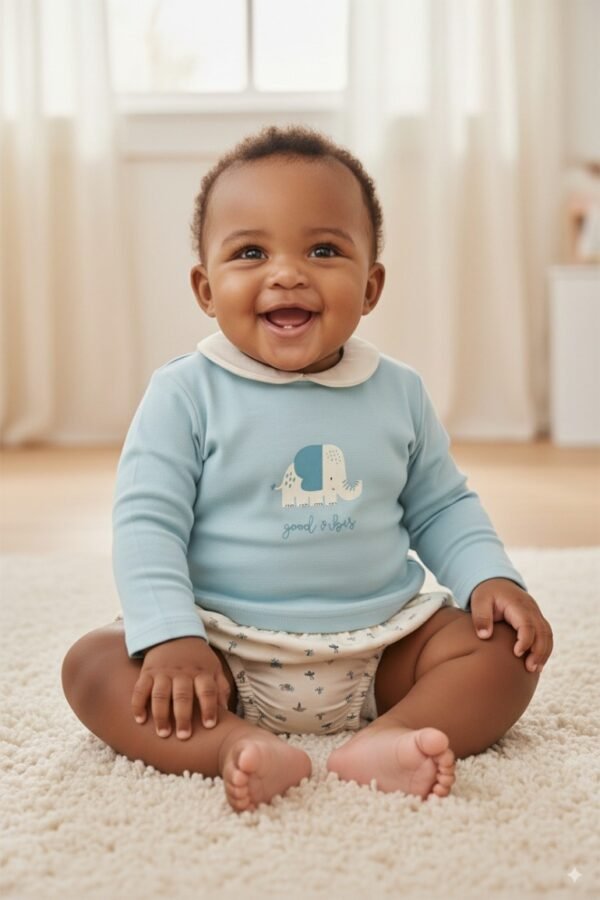 La camiseta, en color azul verdoso, está confeccionada en felpa perchada y presenta cuello bebé, manga larga con puño elástico y un divertido estampado de elefante con la frase good vibes. El cierre trasero con automáticos facilita la puesta en las tallas más pequeñas. La braguita en tono crudo, de felpa suave, lleva un alegre estampado de elefantes y palmeras y cintura engomada para mayor comodidad.