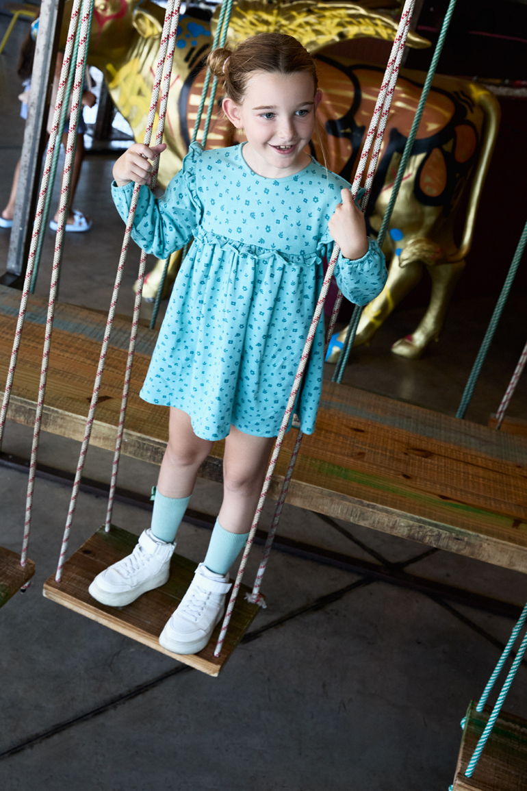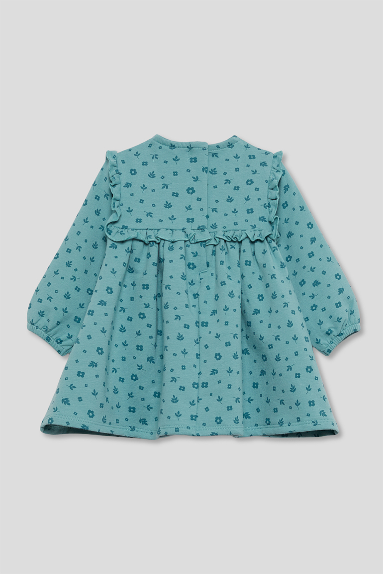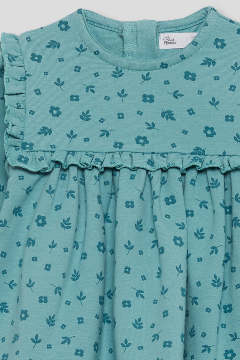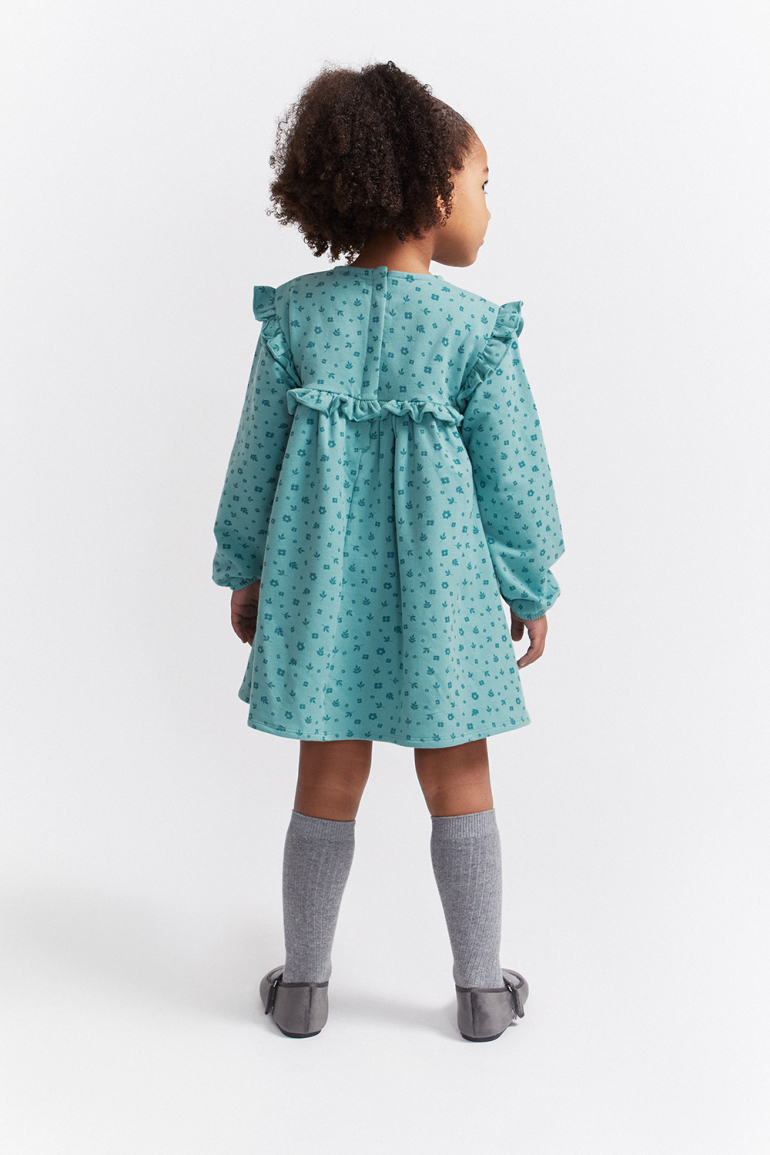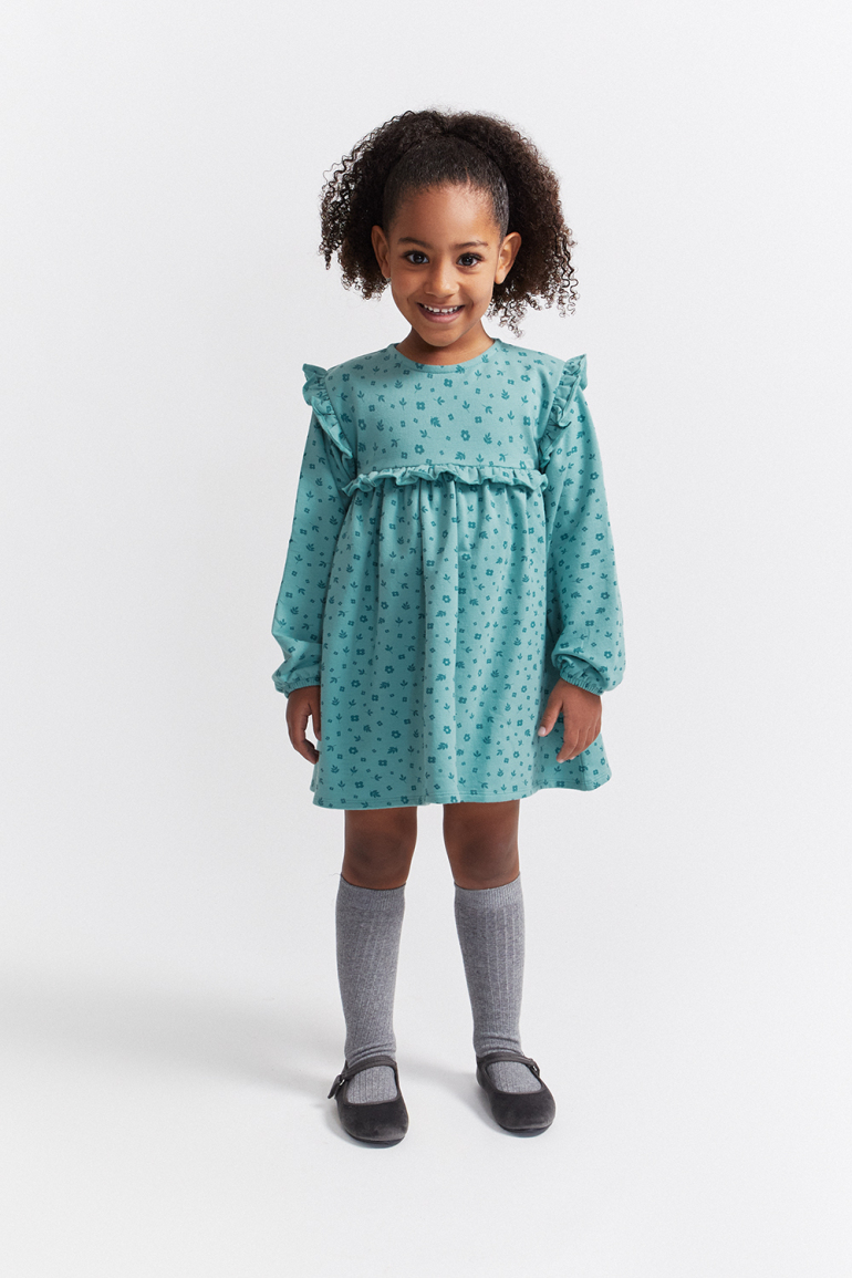 Vestido de niña de infantil, disponible desde la talla 3 meses hasta los 6 años. Vestido de manga larga en color verde amazona con delicado estampado floral en tono más oscuro. Presenta corte alto con frunce, volantes decorativos en los hombros y detalle de volante frontal y trasero a la altura del pecho. Cuello redondo y cierre trasero con botones para facilitar la puesta. Acabado en puños con goma suave. Confeccionado en felpa cálida y agradable al tacto, ideal para los días fríos.